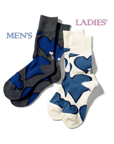 キャッチーなハートも足元なら彼とリンクさせやすい! 1970年代のコミックからアレンジしたハートがあしらわれた靴下は、かかと部分のハートにキスするスヌーピーが♡