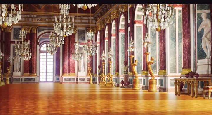 ベルサイユ宮殿内にある、全長75mの鏡張りの回廊、通称〈鏡の間〉。壁の模様、彫刻、シャンデリアの小さなパーツ1つまで美しい。他の場面もとにかく背景が素晴らしく、すべてに驚嘆します。