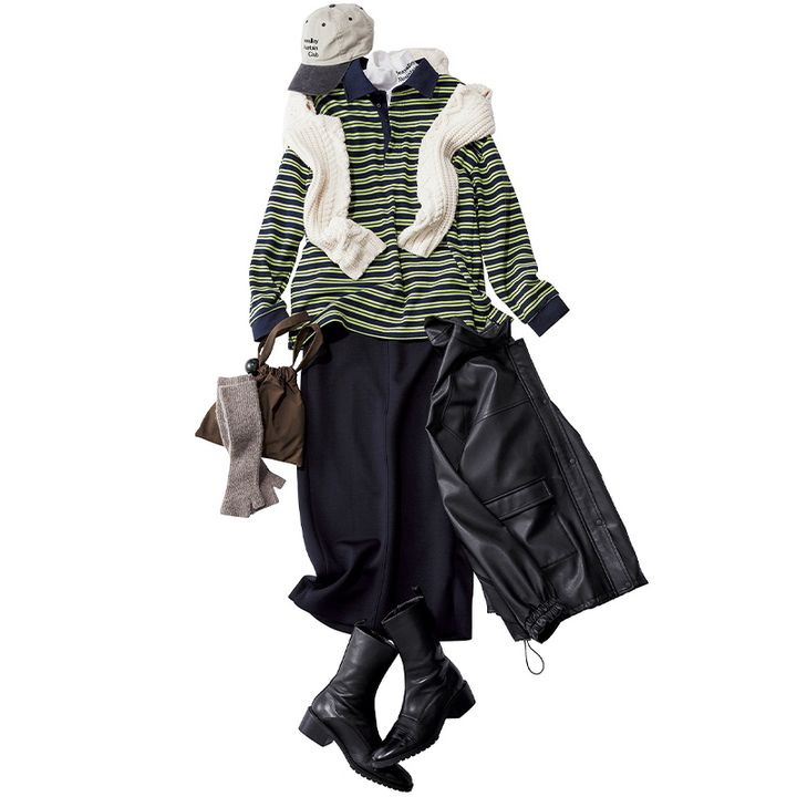 アームウォーマー¥5,940(ミラ オーウェン/ミラ オーウェン ルミネ新宿2店)タートルカットソー¥20,900キャップ¥7,700(ともにシー/エスストア)ジャケット¥31,900(FRAY I.D/FRAY I.D ルミネ新宿2店)肩に掛けたニット¥26,400(HER.)ポロシャツ¥9,900(メゾンスペシャル/メゾンスペシャル 青山店)スカート※価格未定(アルページュストーリー)バッグ¥19,800(バケット バゲージ/アイネックス)ブーツ¥59,400(ツル バイ マリコ オイカワ)