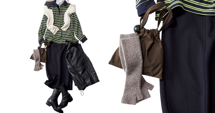 モールや買い出しには中間アウター軸の重ね着防寒がおすすめ。嵩張る厚手アウターよりも動きやすく調整しやすい。旬なレザーブルゾンも長めのアームウォーマーで強化すれば越冬モードに。