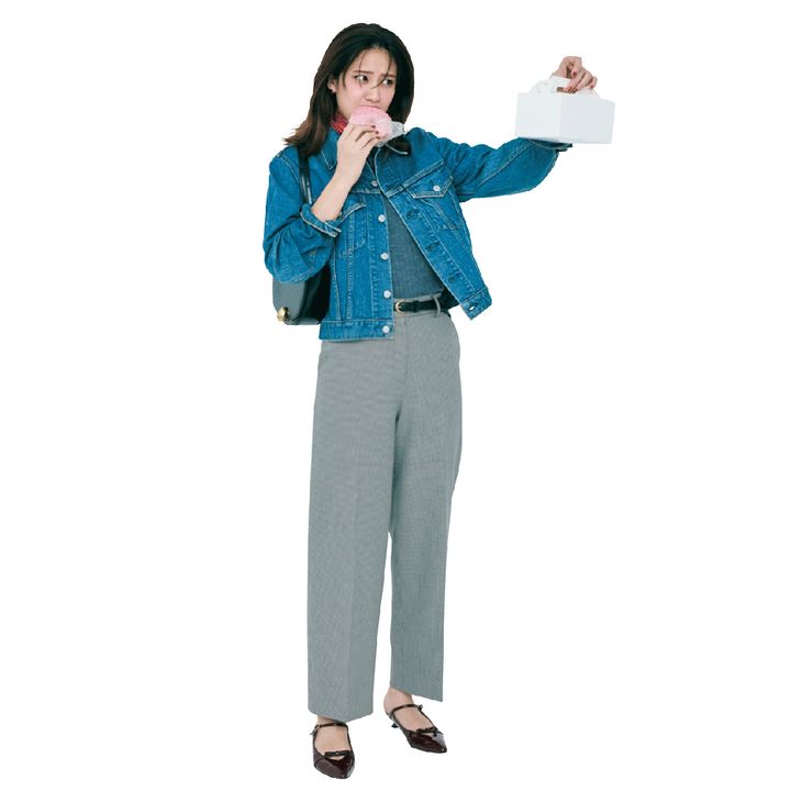 5.パンツ¥14,300(オリヒカ/オリヒカ池袋東口店)デニムジャケット¥41,800(シンゾーン/シンゾーン ルミネ有楽町店)バッグ¥40,700(アーカイブエプク)パンプス¥12,100(ル タロン/ル タロン 有楽町マルイ店)スカーフ¥15,400(マニプリ/アルアバイル)イヤリング¥2,700(アビステ)ベルト¥8,800(ロー ソウル)ポロニット着回し