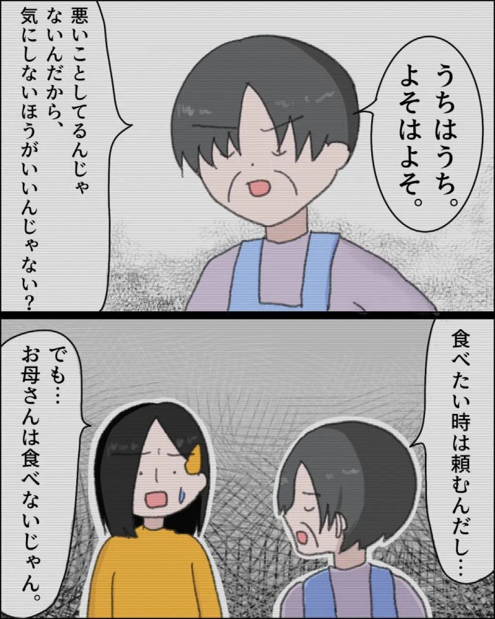 「うちはうち。よそはよそ。悪いことしてるんじゃないんだから、気にしないほうがいいんじゃない?食べたい時は頼むんだし・・・」と言うお母さん。