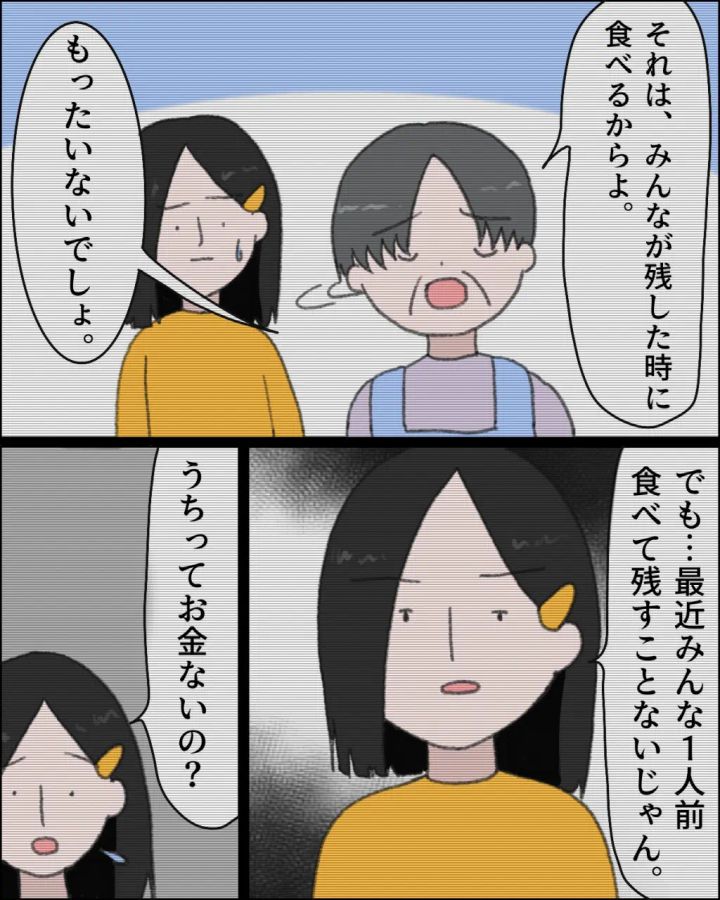 マリちゃんは少し言いにくそうに「でも・・・最近みんな1人前食べて残すことないじゃん。うちってお金ないの?」と聞くと・・・
