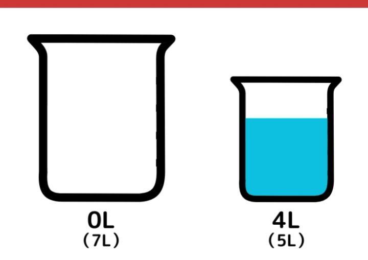 7L容器に入っている水を5L容器に移します。5L容器にはすでに4Lの水が入っているので1Lのみが移り、7L容器の中にはちょうど6Lの水が残ります。
