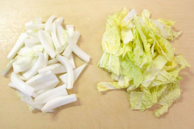 白い部分も葉も長さ4cm、幅2cm程度の細切りにします。