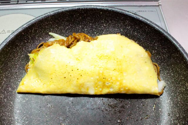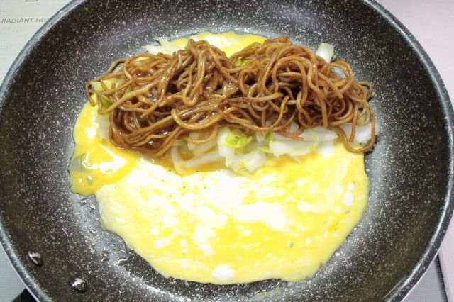 卵が固まったら塩揉みした白菜と焼きそばを乗せ、残った卵液をかけます。白菜も焼きそばも作った2/3程度しか乗りませんでした。