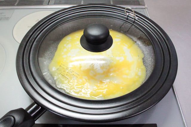 フライパンに卵を流し、フタをして2分ほど蒸し焼きに。
