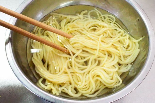 麺をお湯に浸して軽くほぐして湯切りしました。