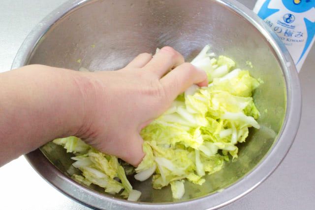 白菜は塩揉みして余分な水分を抜きます。塩味も付いておいしくなりますよ。