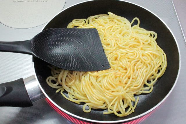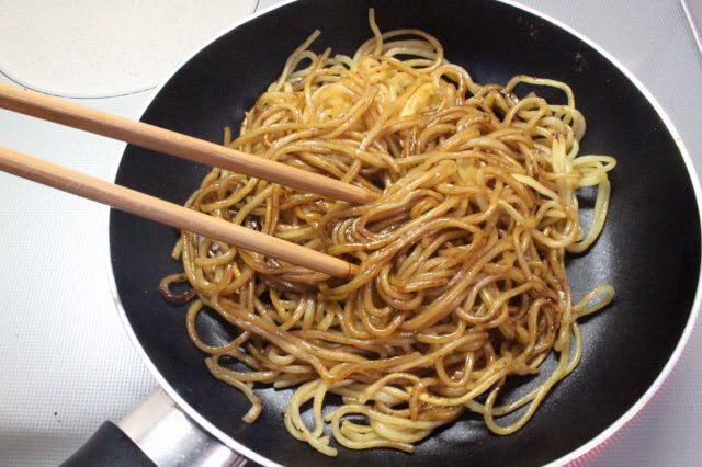 2. 麺を水かお湯に浸して軽くほぐして水気を切り、こめ油(小さじ1)を引いた中火のフライパンで焼き色が付くまでしっかりと焼き、ソースで味付けします。