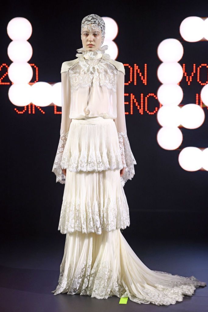 アレッサンドロ・ミケーレが手がけた初のオートクチュールコレクション。首元や袖、スカートにあしらわれたアンティーク風レースやフリル、トランペットスリーブなど、装飾美あふれる一着はレトロ&モード派の花嫁に。
