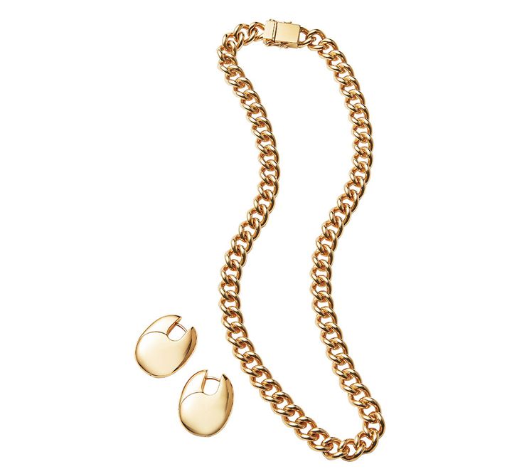 夏カジュアルを高見えさせるゴールドジュエリー。〈右から〉ネックレス¥210,300ピアス¥75,000(ともにトムウッド/トムウッド 青山店)