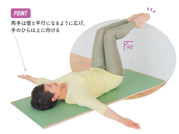 1.あおむけに寝てつま先を伸ばして壁につけ、ひざを90度に曲げる