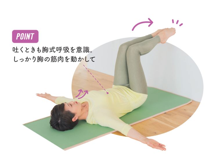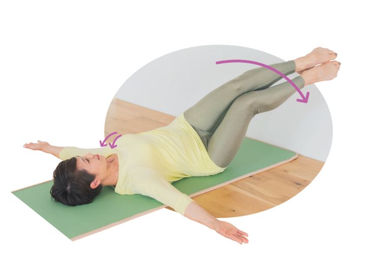 両脚をピタッとそろえた状態で動かすことで、体幹が鍛えられます。ひざやつま先がずれないように、気を付けながら行って。
