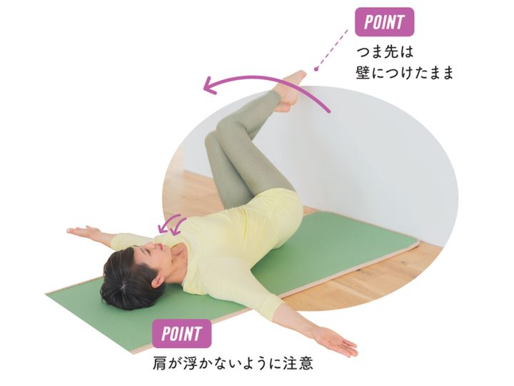 つま先で壁に弧を描くようなイメージで。脚を倒したほうと反対側の肩が床から離れない程度に倒すと安定する。