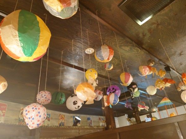 天井に紙風船がたくさん飾ってあって「パンダがいる!」「金魚だ!」と子どもたちがかわいいと気に入り、眺めていました。