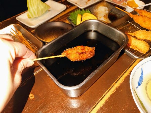 二度つけ禁止のソースにたっぷりと浸していただきます。少し甘くて串カツにあう!サクサクで何個でも食べられます。串カツに欠かせないソース!たっぷりつけて食べるのが本当に美味しい!このソース美味しいんですよね!