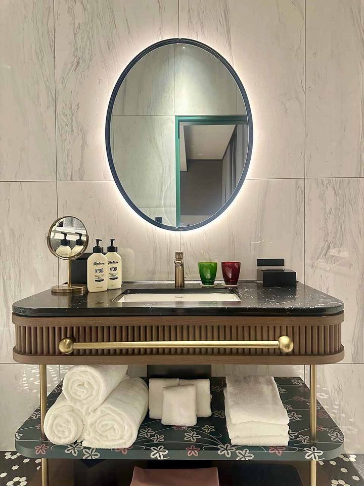 アメニティは「バイオロジー」のボトルが備わっており、環境にも配慮。パウダールームにある、長崎ガラスのコップも素敵。
