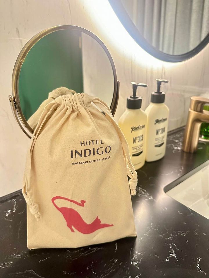 ホテルのシンボル「尾曲がり猫」のイラストが可愛い巾着には、アメニティが入っています。尾曲がり猫とは、長崎に生息するしっぽが曲がった猫のこと。ホテル周辺を散歩すると出会えます♪