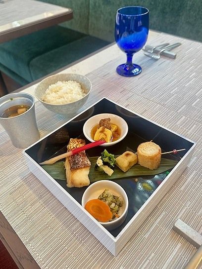 和食は、お重で運ばれてきます。焼き魚、だし巻き玉子、角煮ダイス、かんころ餅、ハトシ、ぶらぶら漬け入りで朝から充実。