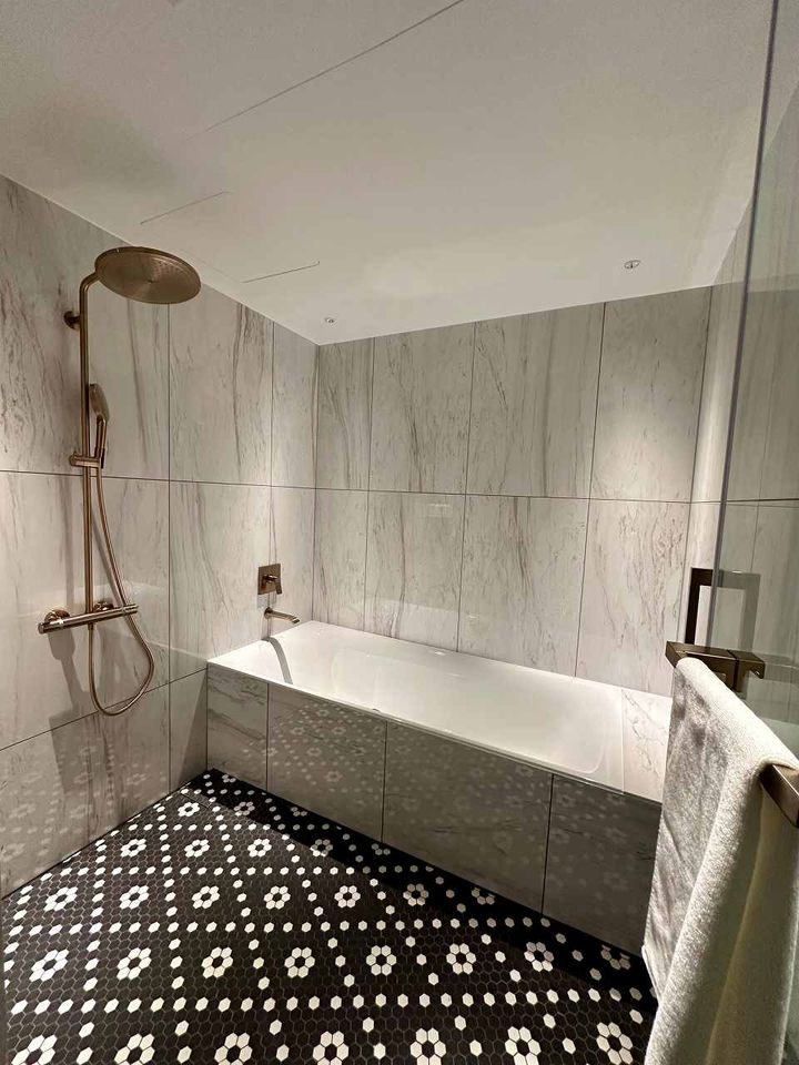 タイルのデザインが印象的な、ゆったりとしたつくりのバスルーム。