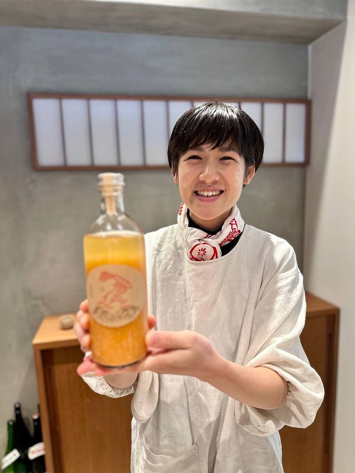 女将の笑顔が素敵なお店。カウンターではお手製の酒の肴とともに、どぶろくをいただけます。