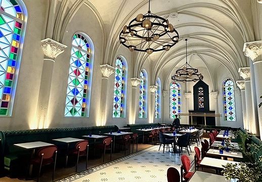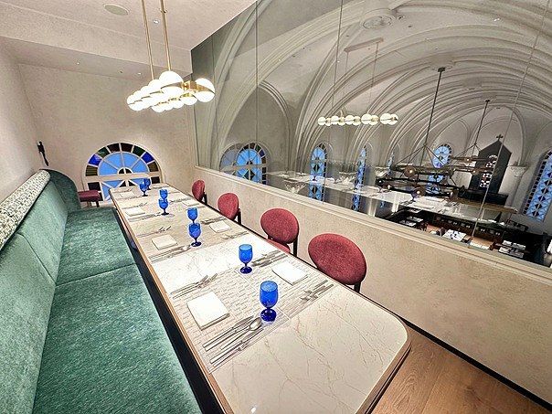 聖堂だった場所は、華麗なレストランへと変貌しています。約10mもの高さをもつリヴ・ヴォ―ルトとよばれる天井様式は目を見張るほど美しく、大きなステンドグラスから光が射しこみ煌めく様はとても神秘的です。朝食、ランチ、ディナーに加えて、カクテルやワインなどスタッフ厳選のドリンクもラインアップ。レストランを一望できるプライベートルームもあります。