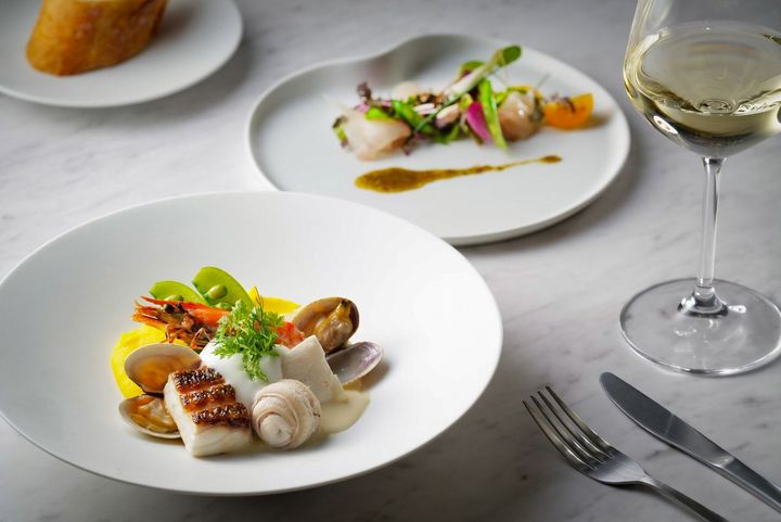 長崎の厳選された食材を使用しネイバーフッドの食材を堪能するシグネチャーディナーコース「Blanche」。 ¥12,500(サ別)手前:シェフのスペシャリテ「魚介のコトリヤード ~白いブイヤベース~」。旬の魚介をふんだんに使い、フランス・ブリュターニュ地方の郷土料理であるコトリヤードに海醤で中華のアレンジを利かせています。奥:「とらふぐ昆布マリネ 長崎薬味ゆうこう胡椒ソース」。