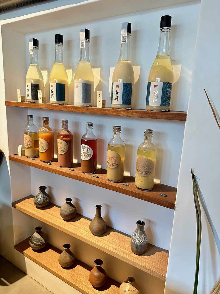 看板商品の「芳扇」のほかに、農産物をメインに米や麹と発酵させたニュースタイルの季節どぶろく「たすき」など、希少なお酒が並びます。