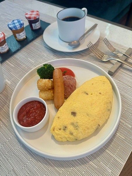 朝食は、メインプレートを和洋いずれか選べるセミブッフェスタイル。 ¥4,400(サ別)写真は洋食のアメリカンプレートで、長崎のソウルフード・角煮入りの絶品オムレツ!メイン以外にサラダ、前菜、ヨーグルト、フルーツ、ブレッド類をブッフェスタイルで楽しめます。