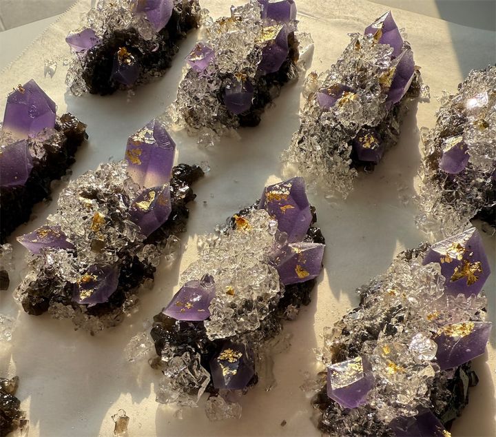 切り出したばかりのアメシストモチーフの琥珀糖。刻んだ寒天と金粉で本物の原石のような風合いを出している。