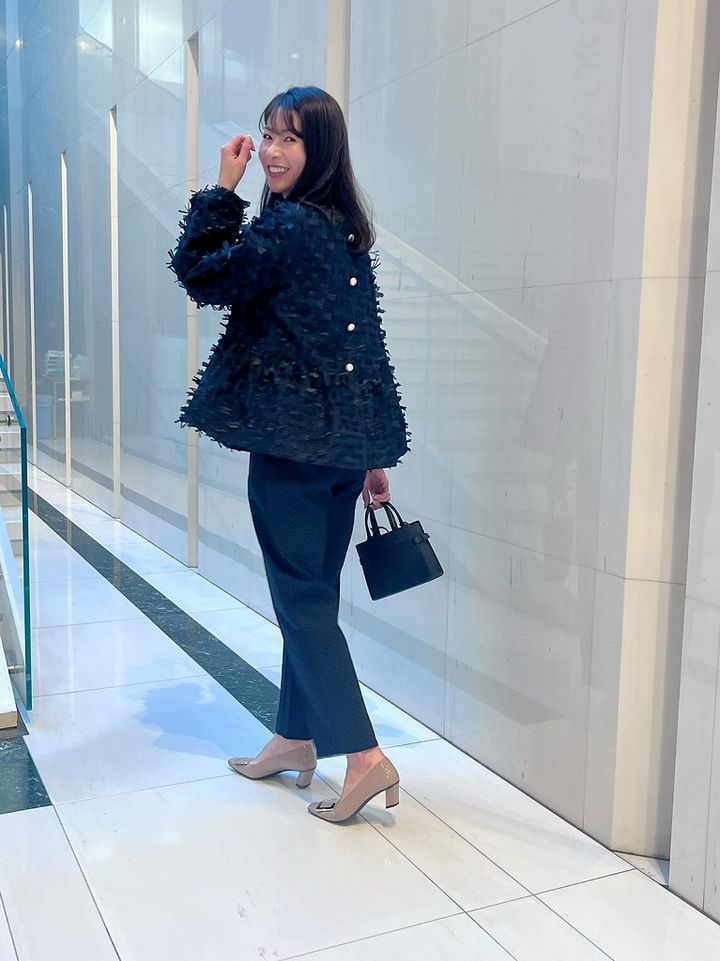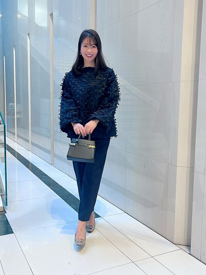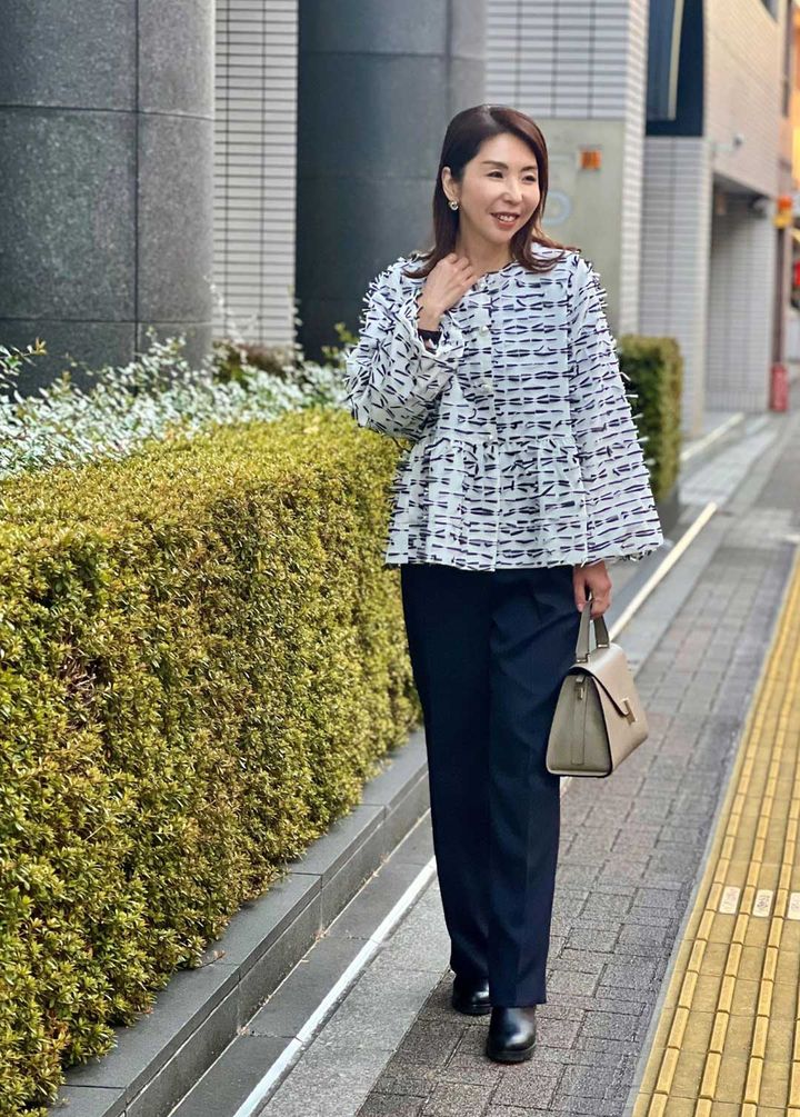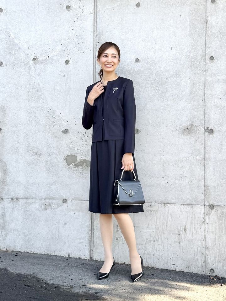 息子の通う学校は一貫校。なので、入学式は平日で簡単に終わることもあり、式後そのまま仕事へ行くこともあるかと思い、比較的カジュアルにまとめました。中学生までは厳格なネイビースタイルが基本でしたが、高校生になるのでトップスだけは遊び心をプラス。ディテールが凝っているアウターは華やかに見え、思い出の写真も映えそう。卒業式は、ママ友と着物を着る予定です。