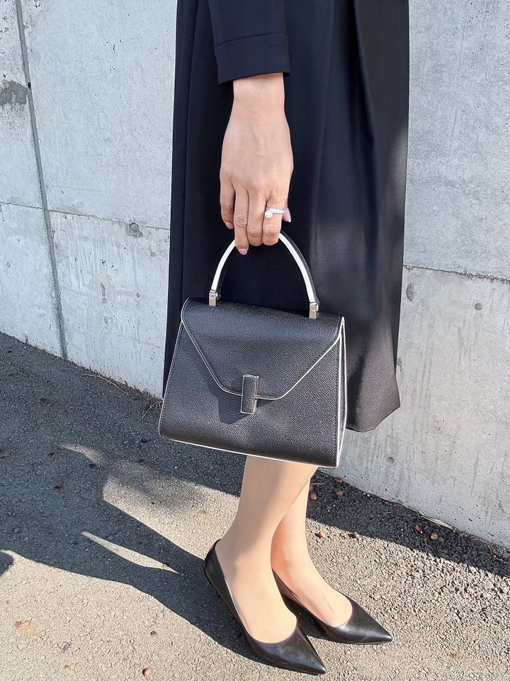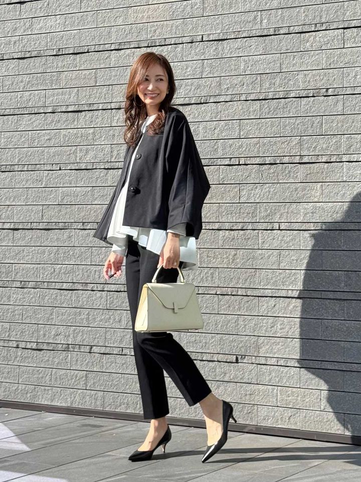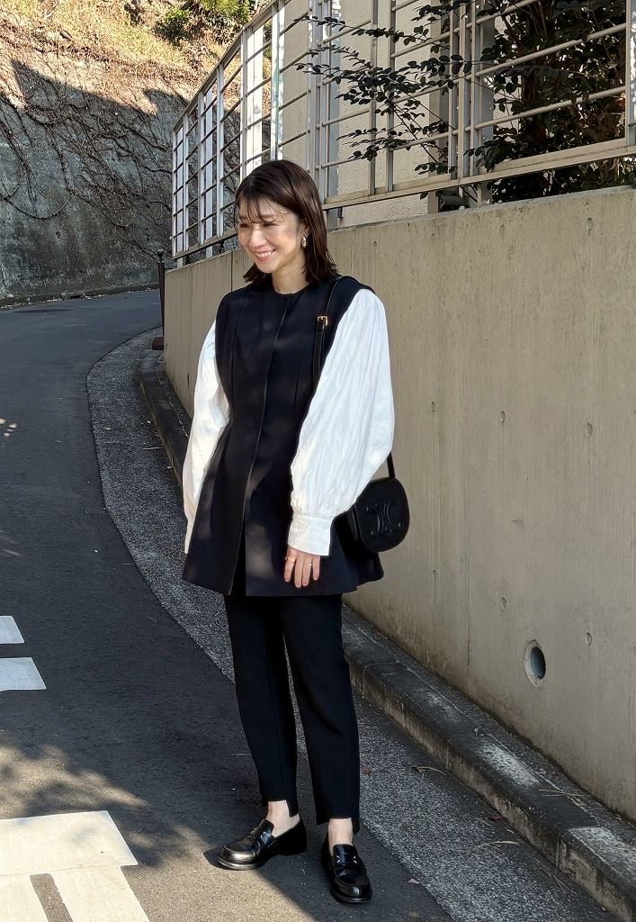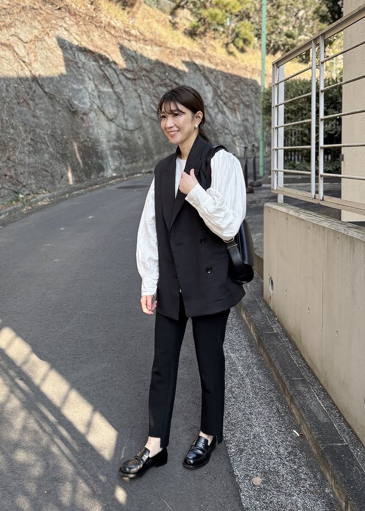 あまりかしこまり過ぎない保育園の卒園式は、モードが好きな私らしさをそのままで。ブラックパンツとボリュームスリーブでシンプルにまとめたワンツーコーデにマニッシュなジレを合わせ、単調にならないようにしました。ジルサンダーのカンノーロはモダンな細横型のデザインバッグでモード感を増してくれます。卒園式だけではなく、デイリー使いにも着まわしができるアイテムで揃えました。