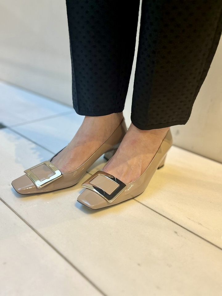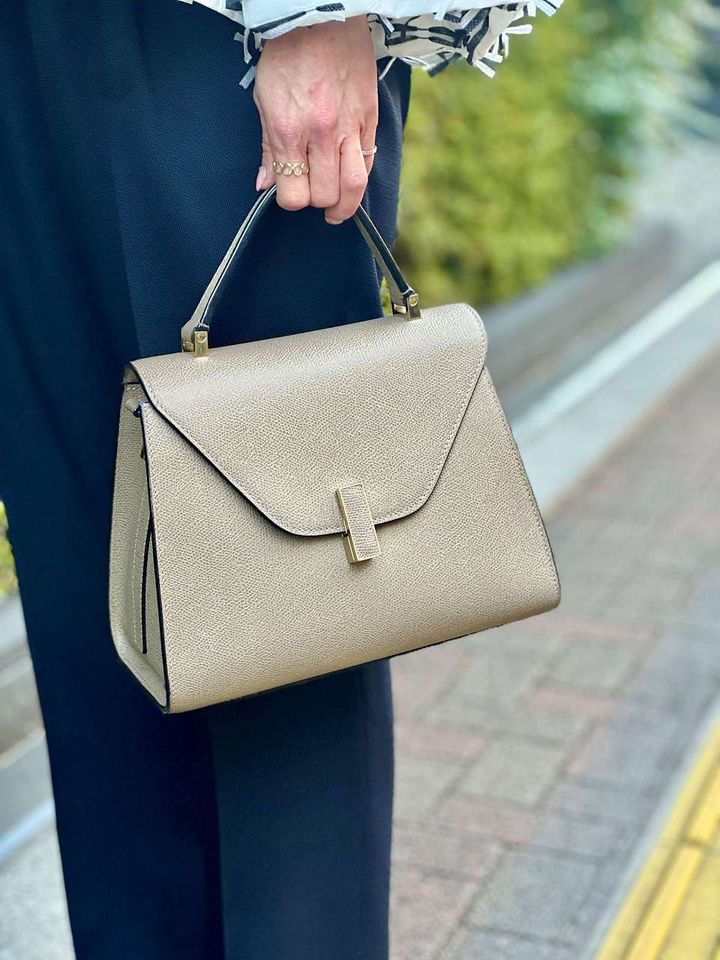 入学、入園などの式典では明るい色のセレモニー服を着たいので、ベージュのセットアップを選びました。セットアップだと上下の生地感や色味の組み合わせ問題に悩まされることがなくお気に入り。胸元にはジュエリーのようなパールが施され、顔やデコルテ周りが華やかになるので入園式にピッタリ。足元は華美になり過ぎないセットアップの色に合わせ、黒のバッグで引き締めました。