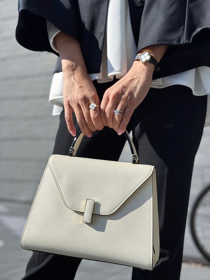 卒園式で着用のジレとバッグを変えて着回しをしました。入学式でははじめての人ばかりなので、やさしい雰囲気を。ボリュームスリーブのブラウスとペプラムラインのレディーライクなジレで甘さを盛り、小ぶりで上品なセリーヌのミニバッグで女性らしく。モノトーンコーデでもカラーフォーマルに負けない華やかアイテムたちでまとめます。