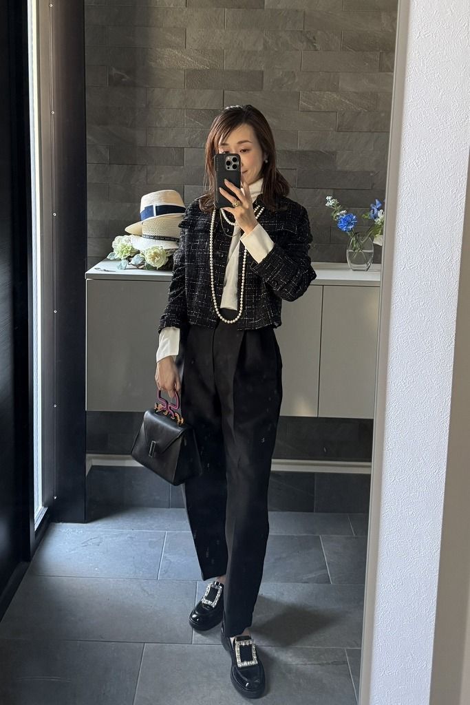 ハレの日は、ツイードジャケットがマスト!ラインがきれいなパンツと袖口に遊びのあるスタンドカラーのブラウスを合わせ、正統派過ぎないセレモニーを楽しみます。胸元にはコサージュ替わりにロングパールと短めパール、ゴールドチェーンのネックレスをレイヤードして顔回りを華やかに。裾から覗くビジュローファーは甘いだけじゃないモード感をMIX。入学式は母のお着物を着る予定です。