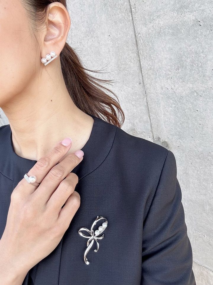 去年息子が受験をし、ご縁をいただいた小学校の入学式は、濃紺のお受験スーツで出席される方が多い学校なので、お受験スーツにパールアクセサリーを合わせてお祝い感をプラスします。りぼん型のブローチを胸元に飾り、シックなスーツが華やぐように。小物はブラックで統一し、髪型もきちんと感を出したいのでシンプルに一つ結びでまとめました。