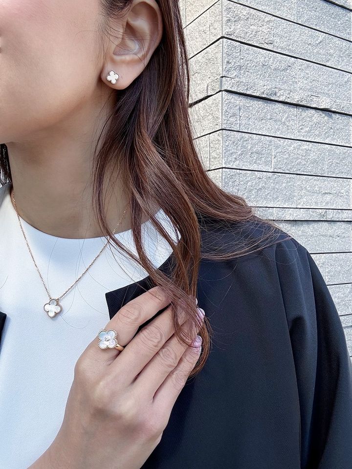 息子が通う幼稚園は自由な園風なので、かしこまり過ぎない卒園コーデに。トップスはペプラムブラウスと丸いシルエットが可愛いジャケットを合わせ、バッグは特別なシーンにピッタリなヴァレクストラの白で清潔感と軽やかさをプラスしました。アクセサリーはヴァン クリーフ&アーペルで統一し、とことん甘コーデを楽しみます。式後、子どもたちは最後の日も思いっきり遊ぶことを想定し、動きやすいパンツスタイルに。