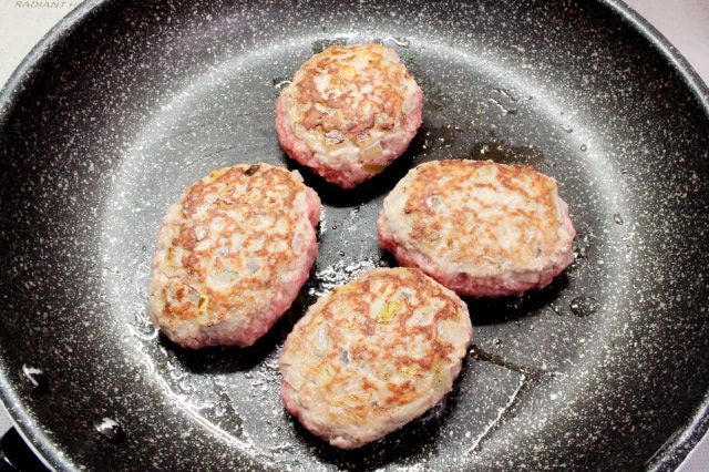 5. 鍋に油を引き、中火で熱します。ハンバーグを並べ、両面に焼き色が付くまで焼きます。