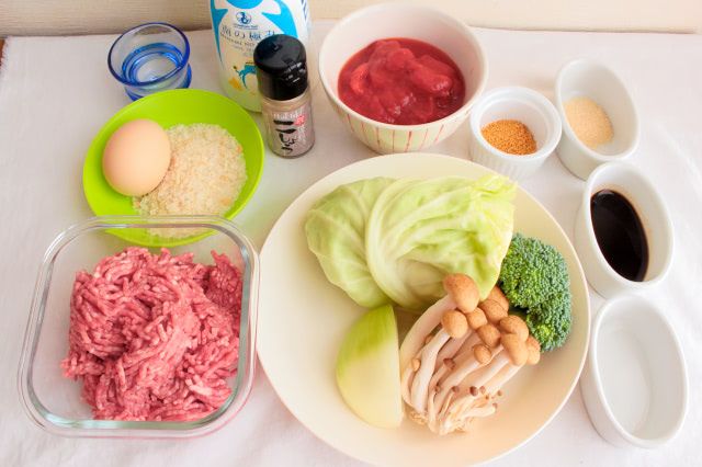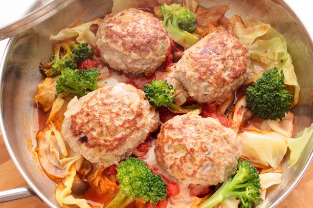 カットトマト、キャベツ、ブロッコリー、しめじの水分でハンバーグを煮込むのがポイントです。
