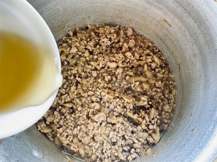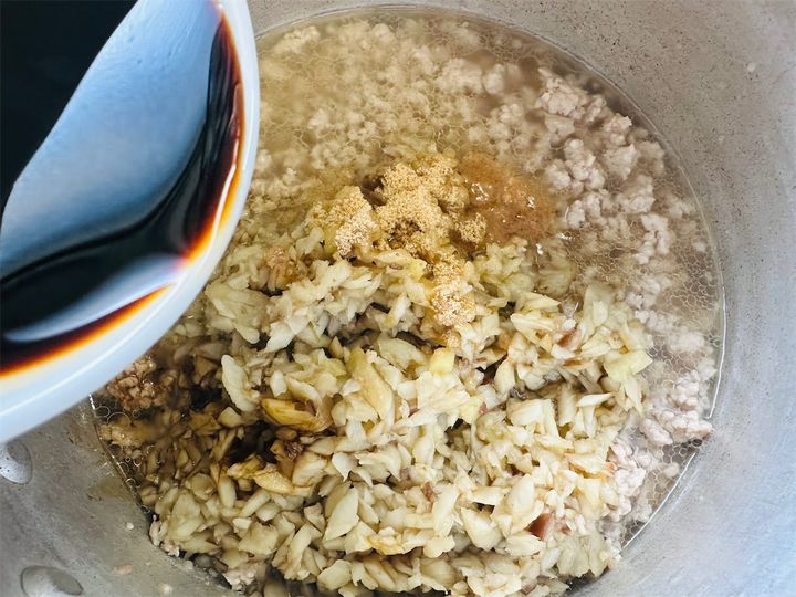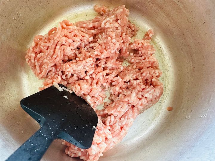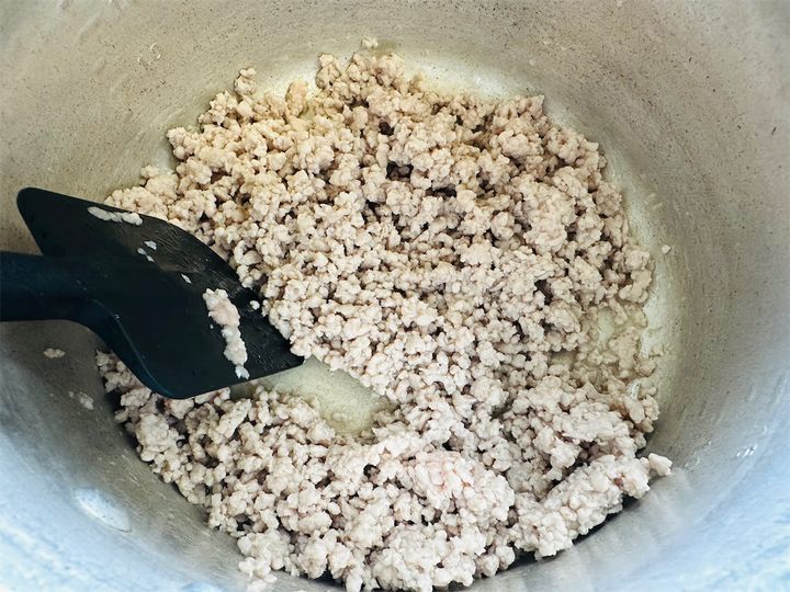 4.別の鍋で豚ひき肉を中火で炒める。