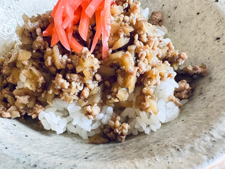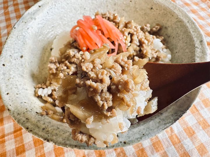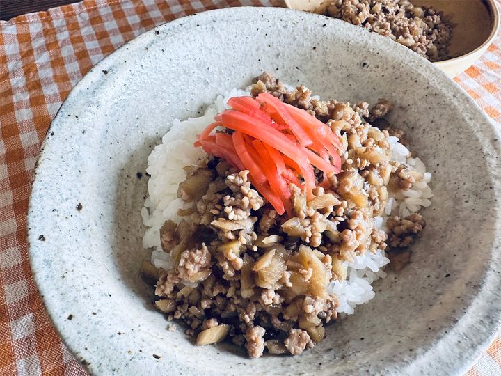 そぼろは地味めですが、差し色の赤が入ると映えますね。紅しょうがをのせると一気に牛丼や豚丼っぽくなるのが不思議です。