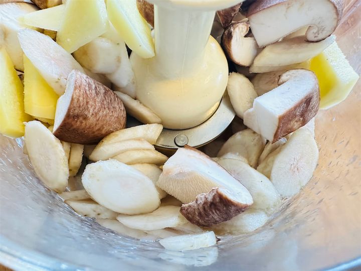 2.1としょうが、しいたけをフードプロセッサーに入れて細かくする。