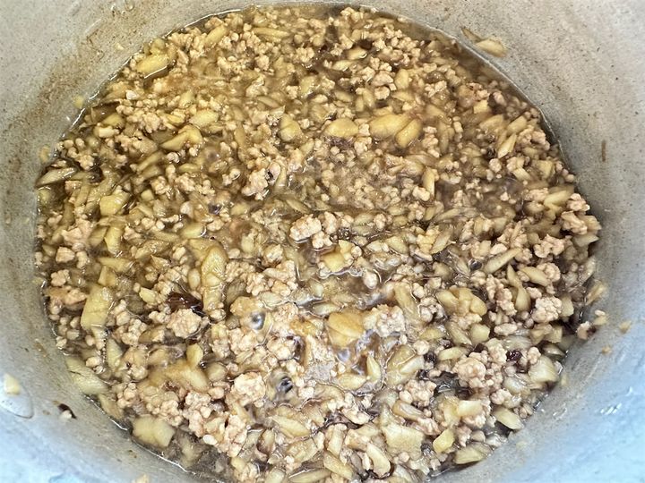 5.4の鍋に3を入れ、調味料[A]を加え弱火で水分が無くなるまで、時々へらでかきまぜ、焦がさないように煮る。