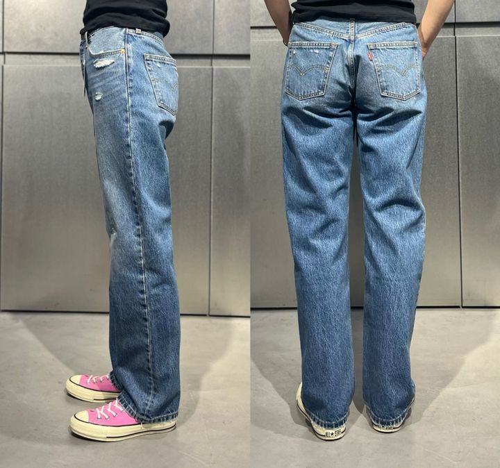 そもそもこちらはレディースにしかないモデル。女性のボディラインで作られていて、バックポケットの位置などはヒップがキレイに見えるように考えられているんだとか。で、脚を入れてすぐに気づいたのですが、従来の「501®」よりシルエットがゆったりしているんです。脚のラインを拾わないストレートシルエットも秀逸で、野暮ったさも一切なくてすっきりとした印象。 とくに膝下のラインがキレイじゃないですか!? あと、リーバイス®ではあまり見られないダメージも入っていて、はきはじめからこなれた雰囲気を醸し出せるのも筆者的にはポイントが高かったです。