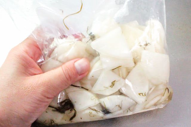 4. ジッパー付き保存袋に酢、砂糖、昆布、唐辛子、3のかぶを入れます。袋の上から揉んで混ぜ合わせ、空気を抜いて袋の口を閉じます。
