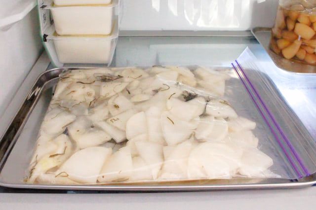 あとは冷蔵庫で1時間ほど漬けるだけ♪30分ほど漬けたところで、調味液がまんべんなく行き渡るように袋の上下を返しました。だし昆布を使った場合は、昆布がやわらかくなるまで漬けてくださいね。