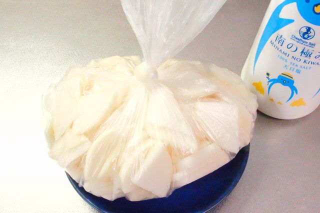 2. ポリ袋に、かぶと塩を入れます。袋を振り、塩を全体にまぶして軽く揉みます。空気を抜いて袋の口を縛り、30分ほどおきます。