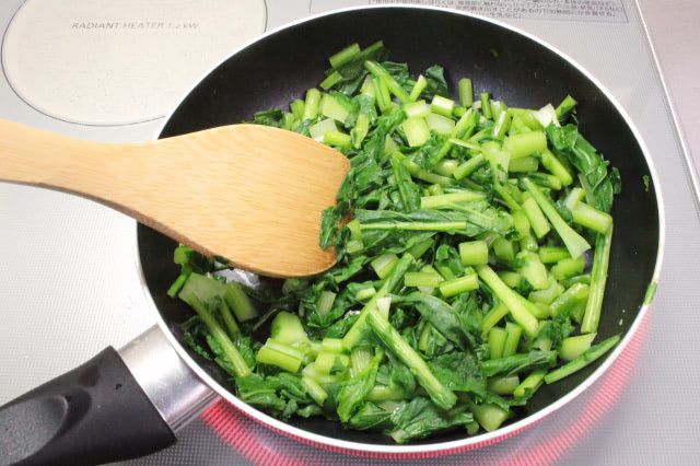 1. フッ素樹脂加工のフライパンを、中火で熱します。小口切りにした茎を入れて2分ほど乾煎りし、細切りにした葉と塩を加え、フライパン内の水分がなくなるまで炒めます。