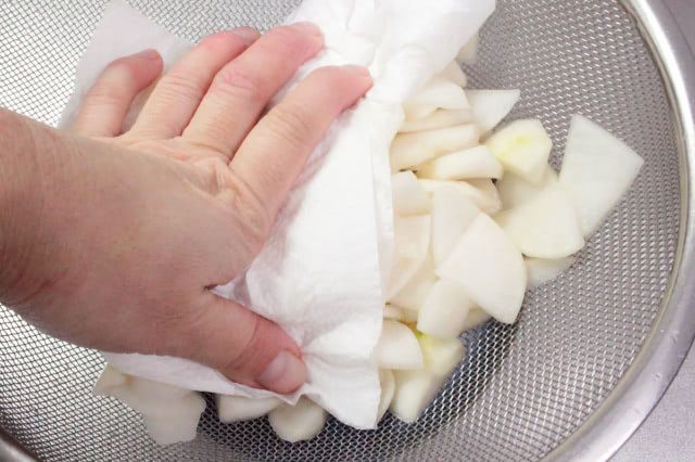 3. かぶの水分をしっかりと絞り、キッチンペーパーでも拭き取ります。